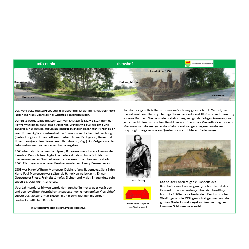 Der Ibbenshof in Wobbenbüll war Harro Harrings Geburtshaus. 1789 erblickte er hier das Licht der Welt als jüngster Sohn von Eltern, die landwirtschaftlich tätig waren. Zwar wurde sein Vater später noch Deichgraf, eine immer schon verantwortungsvolle Aufgabe, bei der viel Wissen und Einfluss nötig waren. Leider verstarb er so früh, dass Harrring relativ bald auf sich gestellt war und nicht den beruflichen Weg in die Landwirtschaft einschlug, sondern im nahen Husum eine Ausbildung als Schreiber absolvierte.